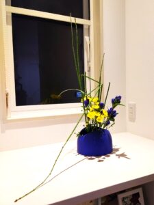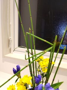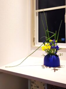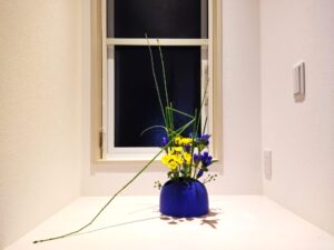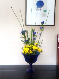 トクサの直線を生かしたお花 お花 Twitter Facebook はてブ Pocket LINE コピー 2023.07.15 今回の花材は、メモし忘れました……(´;ω;`) ・トクサ ・リンドウ ・菊系のお花? といった具合です。 暑くなるなか、スッキリとしたトクサを使って 涼し気に見えるように生けてみました。 横の広がりが欲しかったので、 トクサを折って、 向かって左側に伸ばして生けました。 真ん中に、 オブジェのようにまとめたトクサを 挿しました。 別角度から見たところ 先生が生けたお花 ボリューミーな花材を 青のガラス花器を使って、 涼し気に生けられています。