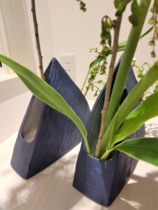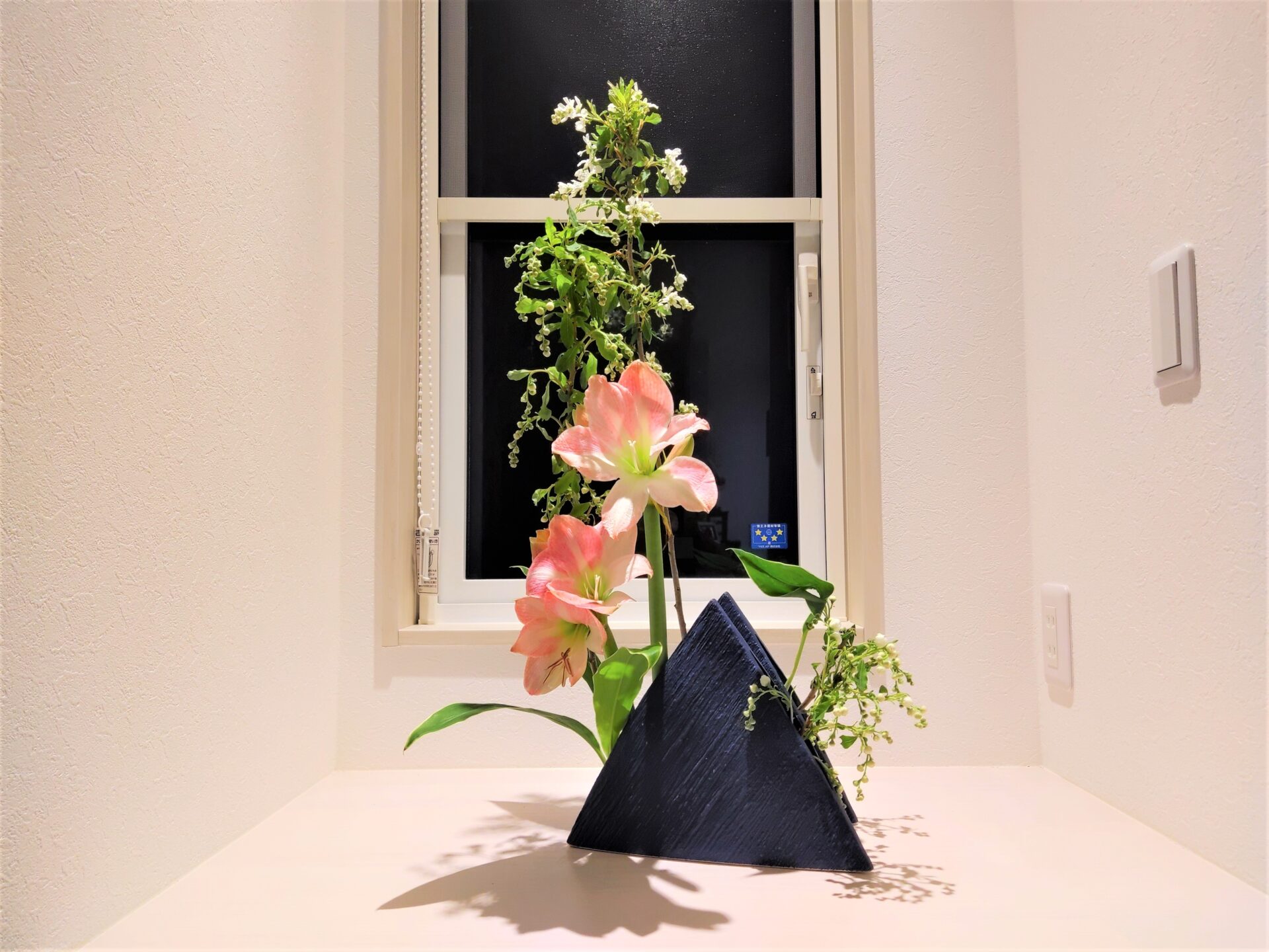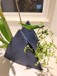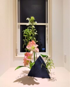 紺色の三角形の花器を二つ使いました。