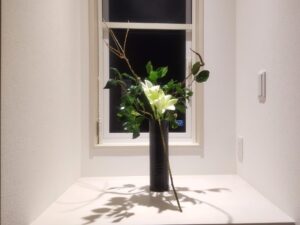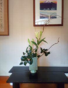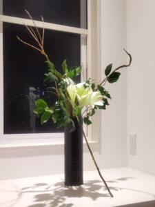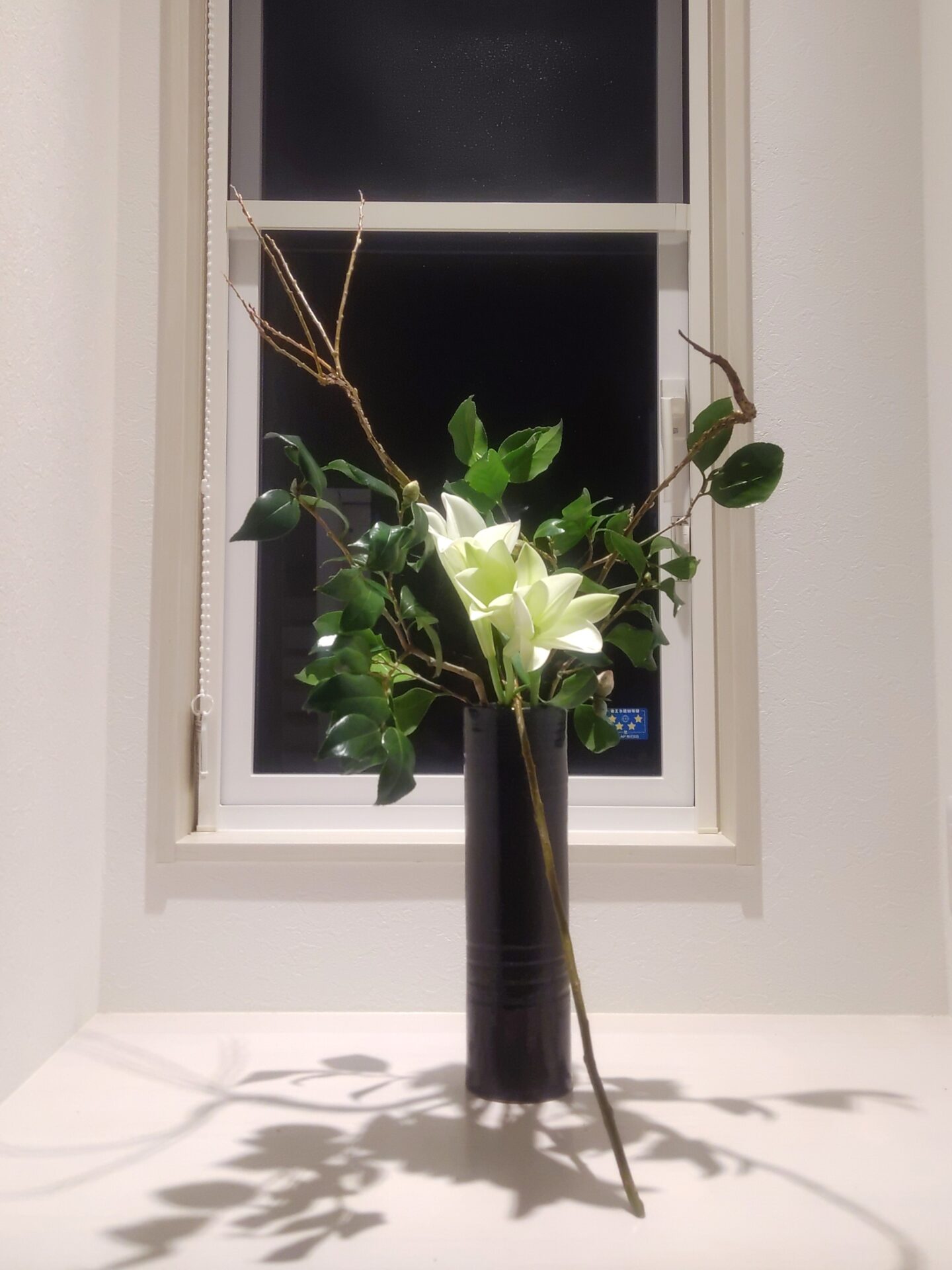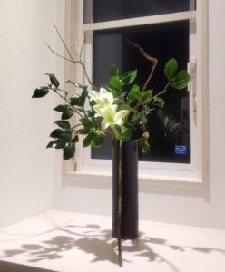 木の枝を外に立てかけた投入の生け花 お花 Twitter Facebook はてブ Pocket LINE コピー 2024.11.24 今回の花材は、 ・石化柳 ・すかし百合 ・椿 です。 石化柳の枝がしっかりしているので 久しぶりに投入の勉強をすることにしました 石化柳は水がなくても使えそうでしたので アクセントとして 一本手前に立てかけてみました。 その他の花材は、石化柳の枝を使った 十文字留めで生けています。 別角度から見たところ 先生が生けたお花 石化柳のうねりのある枝で 動きを出されていました。 椿の葉っぱを少なめにしているのも 百合が引き立っていて素敵ですね!(^^)!
