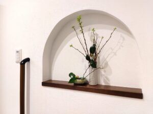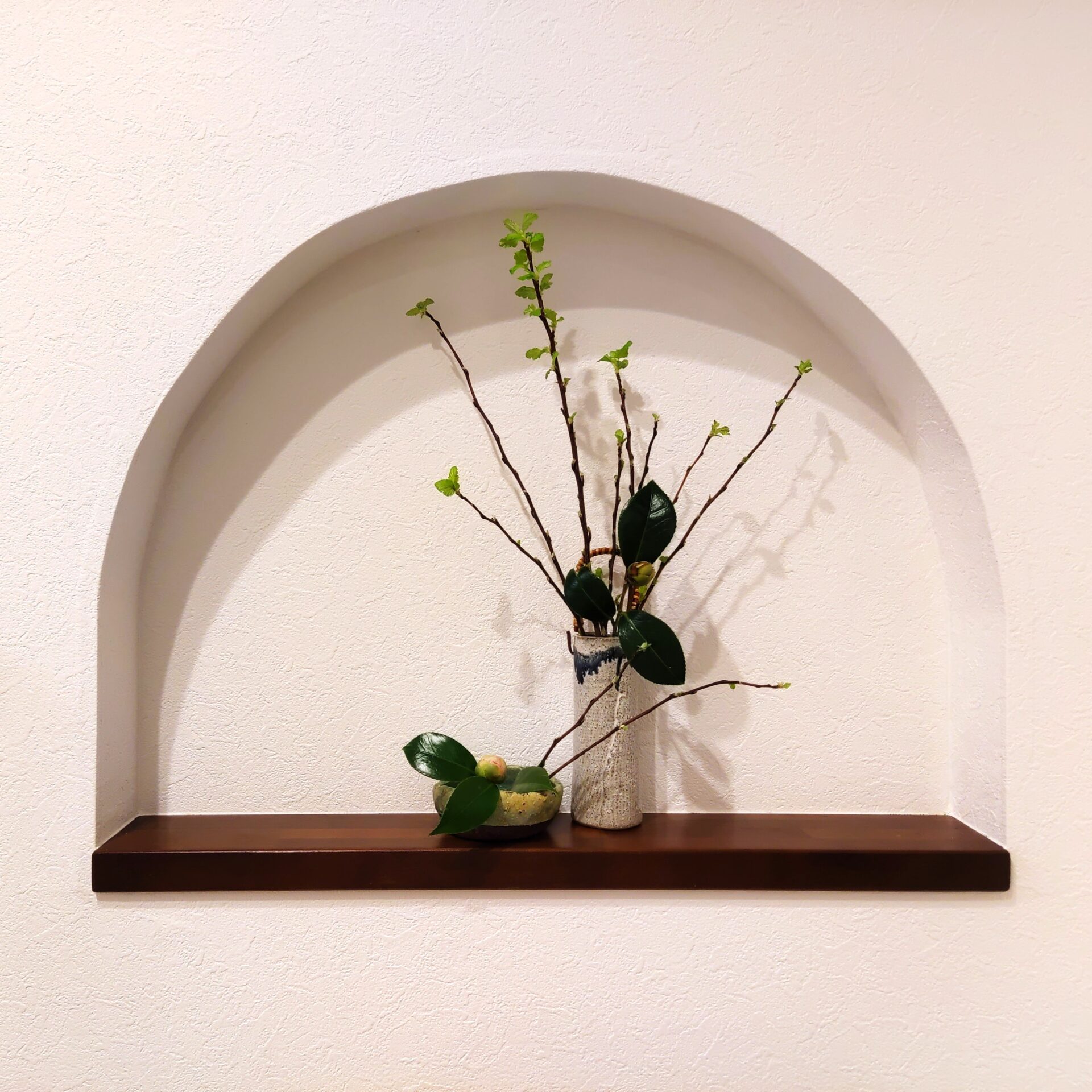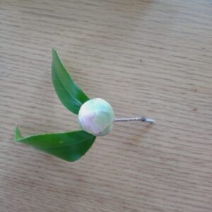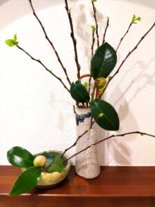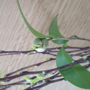 葉っぱと一緒に可愛らしい枝ぶりの椿の蕾