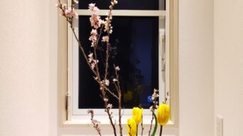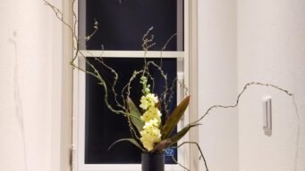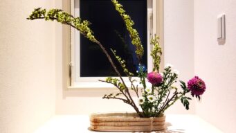 長い枝を傾けて生けたお花 基本傾真型・盛花
