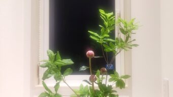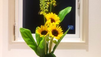 モンステラの葉で作った面とフトイの直線を対比させたお花
